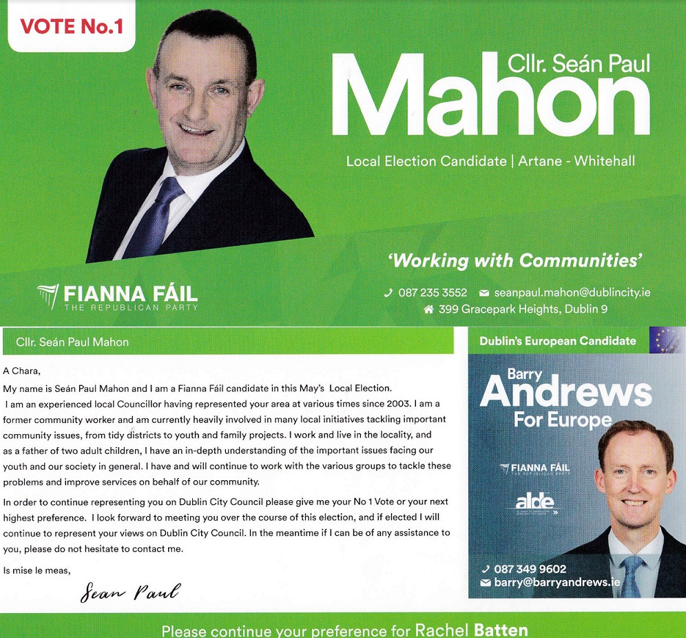 Leaflet from Seán Paul Mahon – Fianna Fáil – Artane Whitehall #LE19 » SeanPaulMahon1