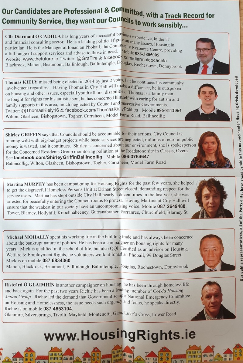 A leaflet from the Cork based Housing Rights and Reform Alliance. It has their aims as well as profiles of all their candidates.