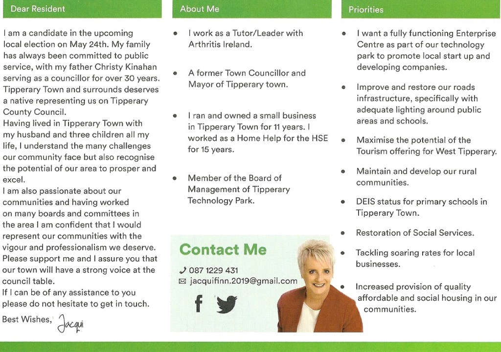 Leaflet from Jacqui Finnan – Fianna Fáil – Cashel-Tipperary #LE19 » JacquiFinnan2