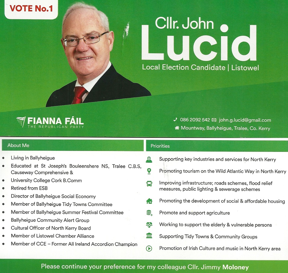 Leaflet from John Lucid – Fianna Fáil – Listowel #LE19 » JohnLucid1
