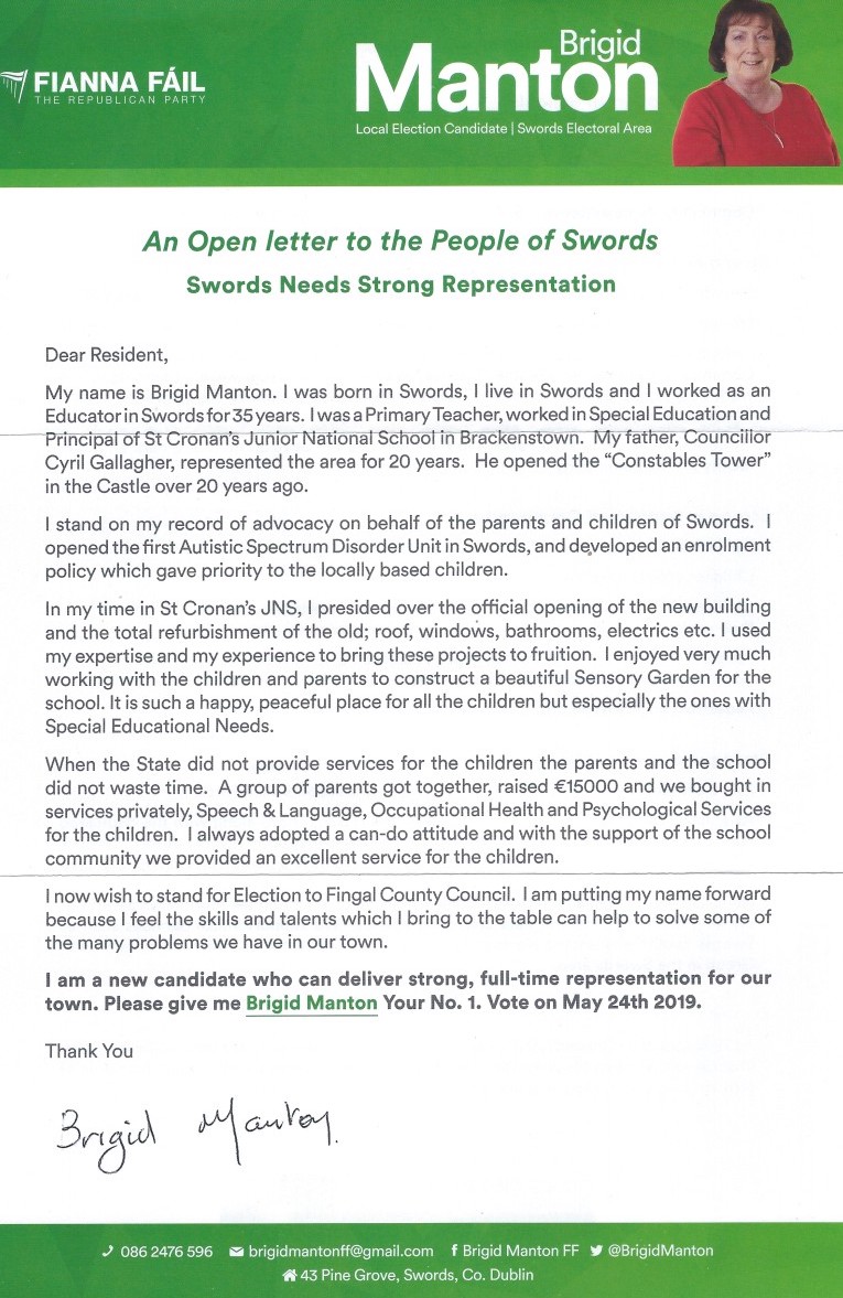 Letter to voters from Brigid Manton – Fianna Fáil – Swords #LE19 » Manton1A