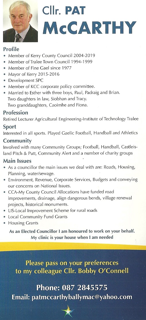 Leaflet from Pat McCarthy -Fine Gael – Castleisland #LE19 » PatMcCarthy2