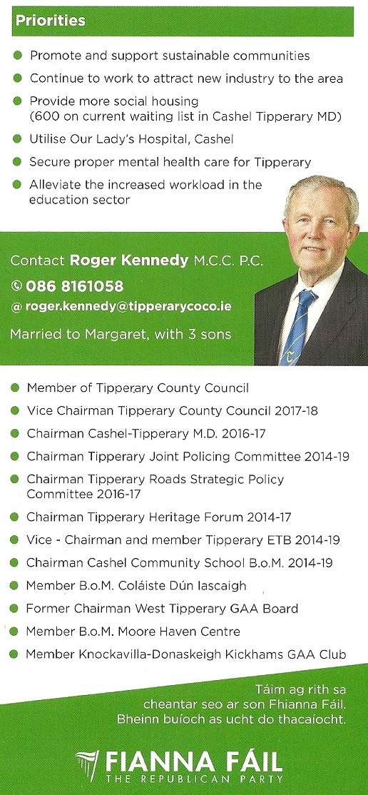 Leaflet from Roger Kennedy – Fianna Fáil – Cashel-Tipperary #LE19 » RogerKennedy2