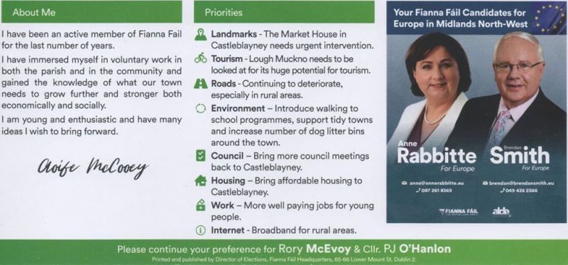 A Leaflet from Aoife McCooey who is running for Fianna Fáil in Carrickmacross Castleblayney for a seat on Monaghan County Council.