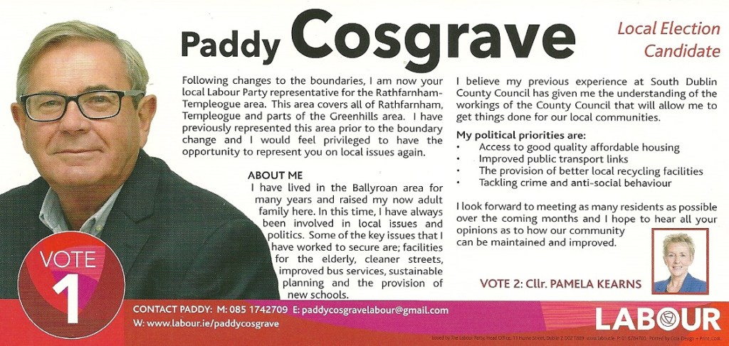 Leaflet from Paddy Cosgrave – Labour – Rathfarnham Templeogue #LE19 » PaddyCosgrave1