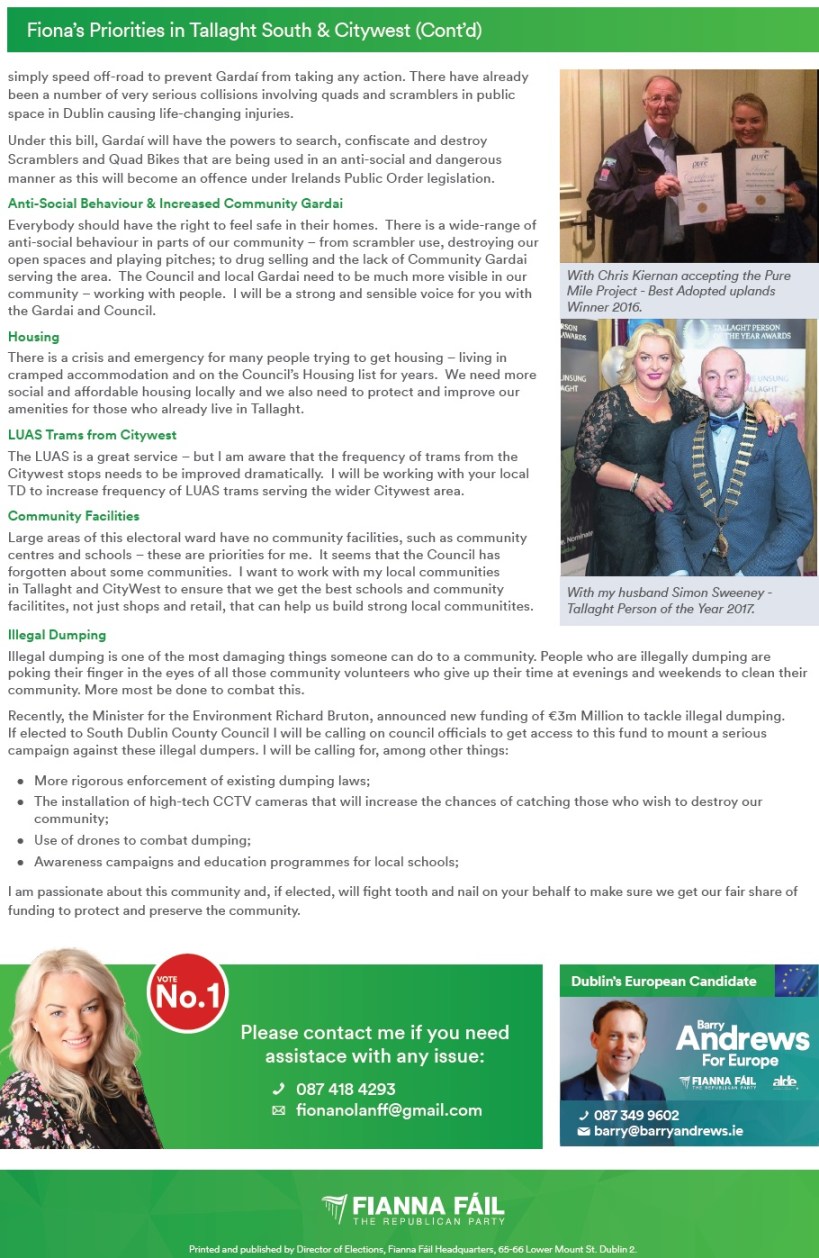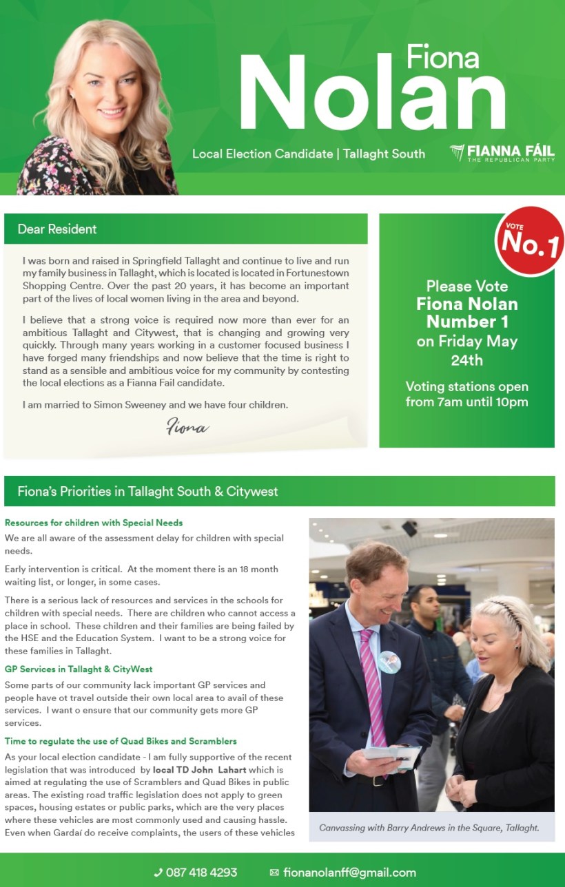 A Leaflet from Fiona Nolan who is running for Fianna Fáil in Tallaght South for a seat on South Dublin County Council.