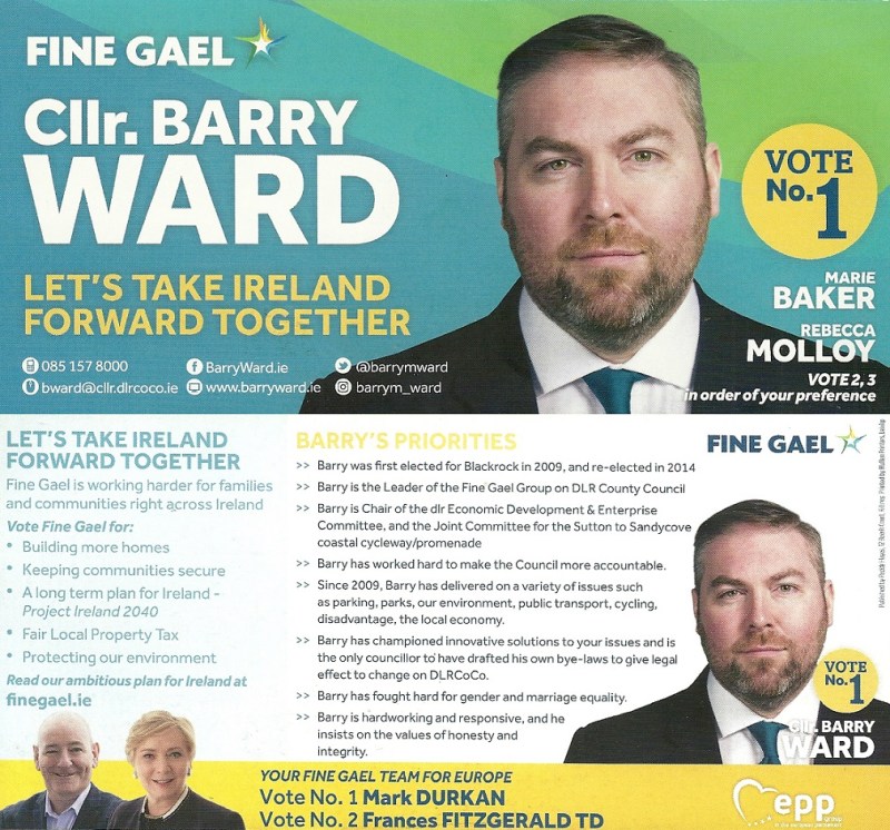 A Leaflet from Cllr Barry Ward running for Fine Gael in Blackrock.
