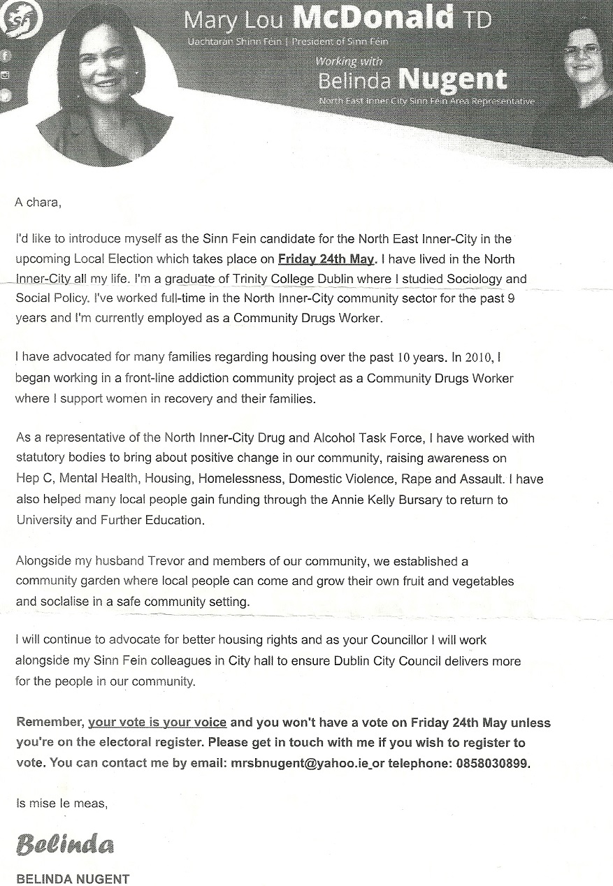 Leaflet from Belinda Nugent – Sinn Féin – North Inner City #LE19 » BelindaNugent2