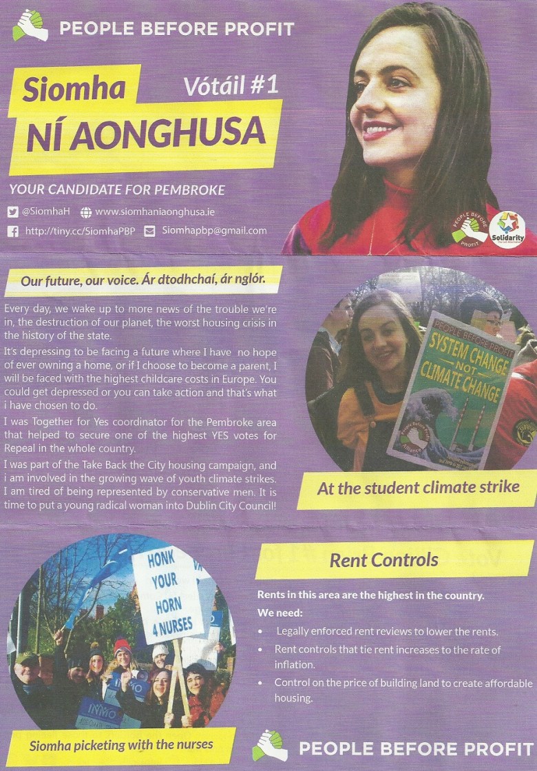 A Leaflet from Siomha Ní Aonghusa who is running for People Before Profit in Pembroke for a seat on Dublin City Council.