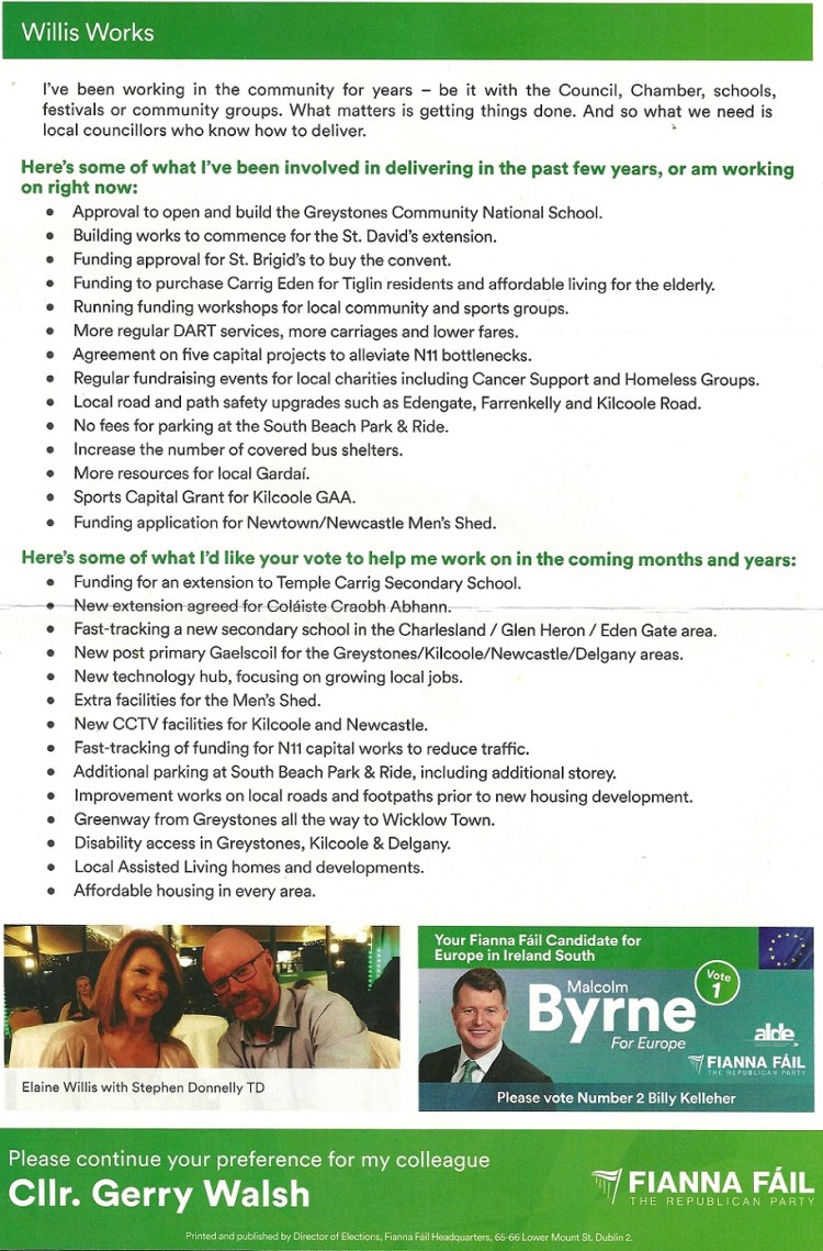 A Leaflet from Elaine Willis who is running for Fianna Fáil in Greystones for a seat on Wicklow County Council.
