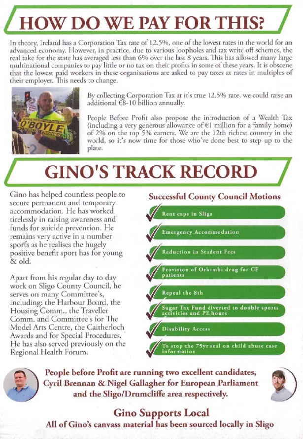 Leaflet from Gino O’Boyle – People Before Profit – Sligo Strandhill #LE19 » GionOBoyle4