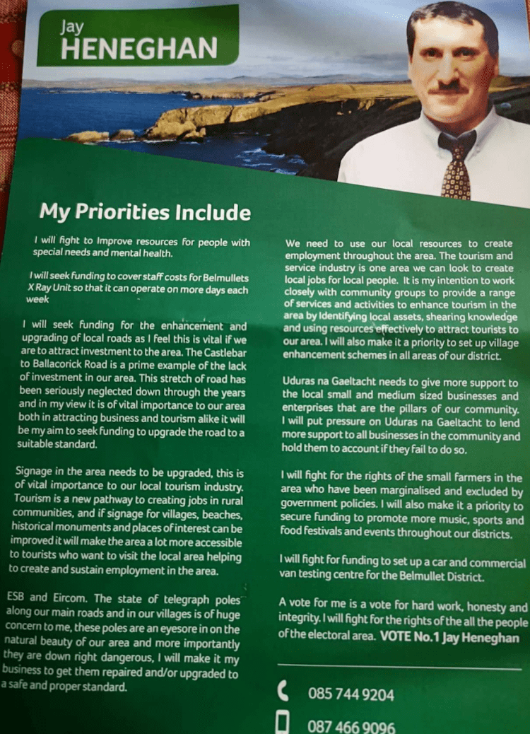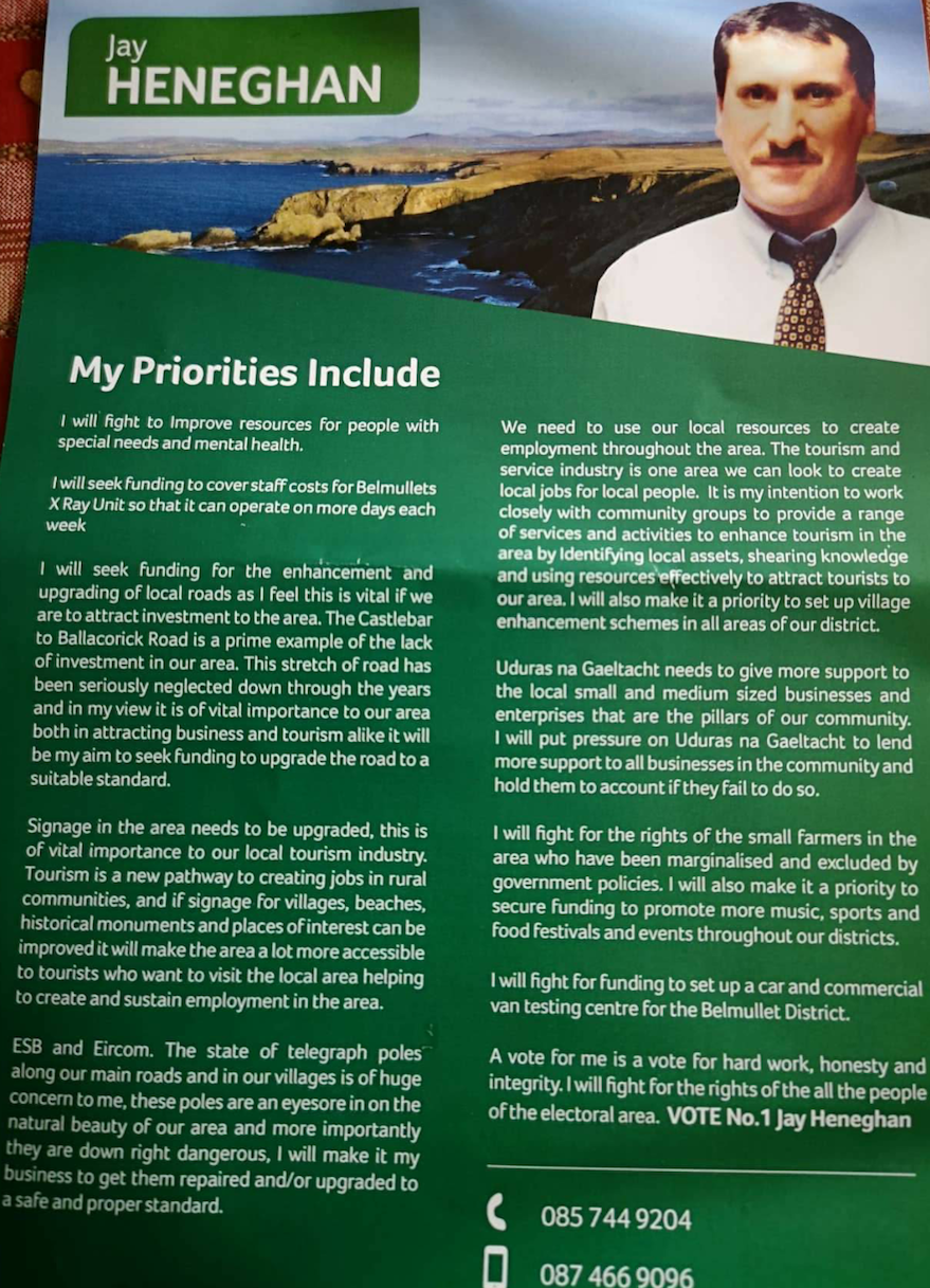 A Leaflet from Jay Heneghan running as an Independent in Belmullet for a seat on Mayo County Council.