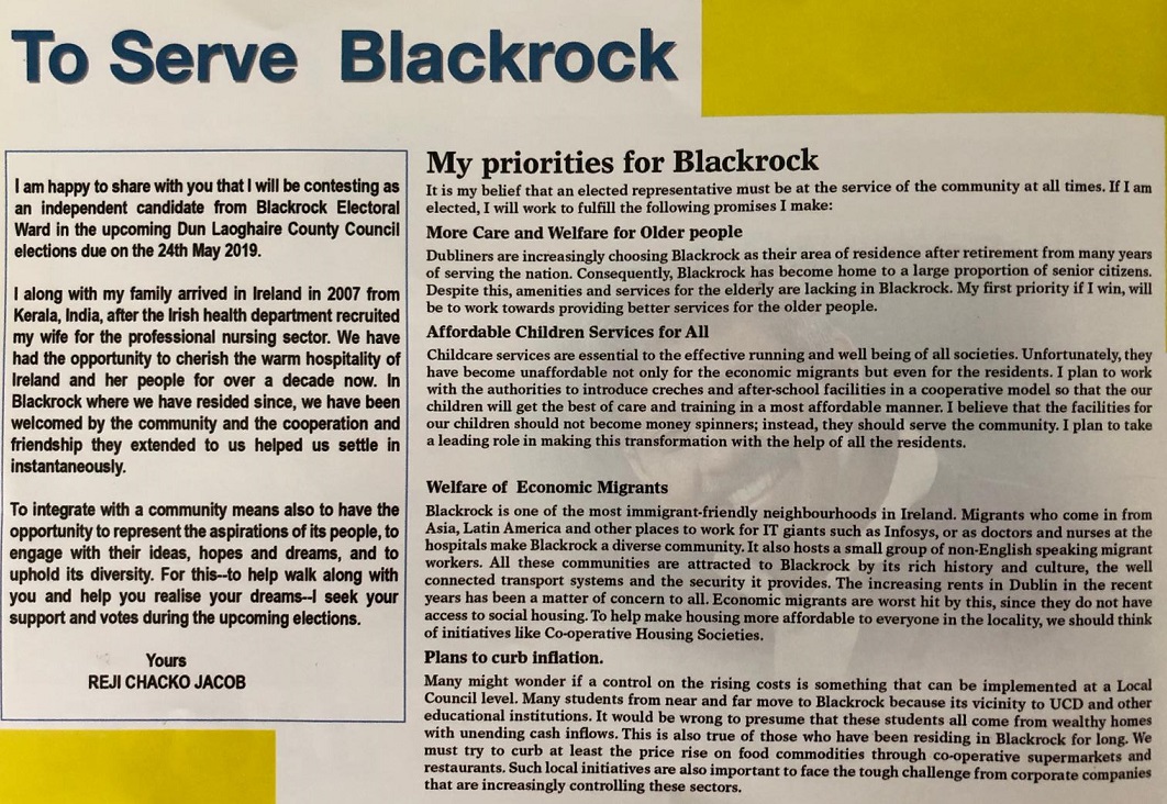 A Leaflet from Reji Chacko Jacob running as an Independent in Blackrock for a seat on Dun Laoghaire Rathdown County Council.
