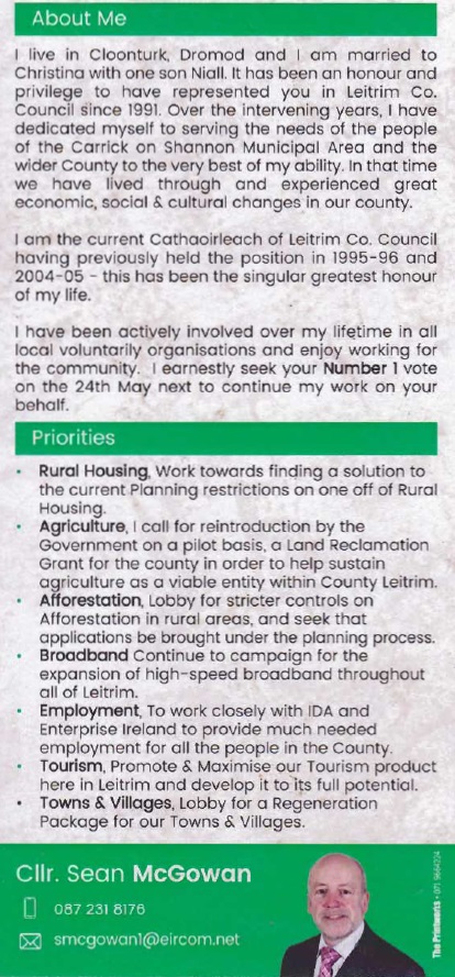 Leaflet from Sean McGowan -Fianna Fáil – Carrick on Shannon #LE19 » SeanMcGowan2