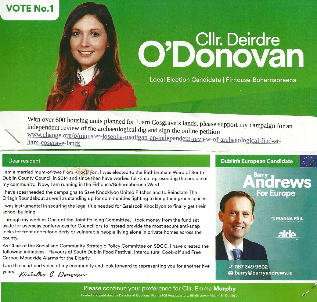 A Leaflet from Deirdre O’Donovan who is running for Fianna Fáil in Firhouse-Bohernabreena.