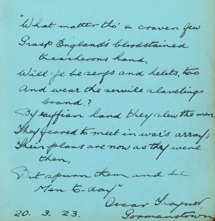 An incredible piece of Irish History, an autograph book from Gormanstown Internment Camp during the Civil War, belonging to Patrick Cahill. It contains 49 pages of autographs, messages and drawings by fellow prisoners many who went on to become prominent people within the State. Among those who signed the book are future President Sean T O’Kelly, Oscar Traynor and well over 100 others. It’s fascinating looking up the names in the Bureau of Military History archives to see what each did in the War of Independence.