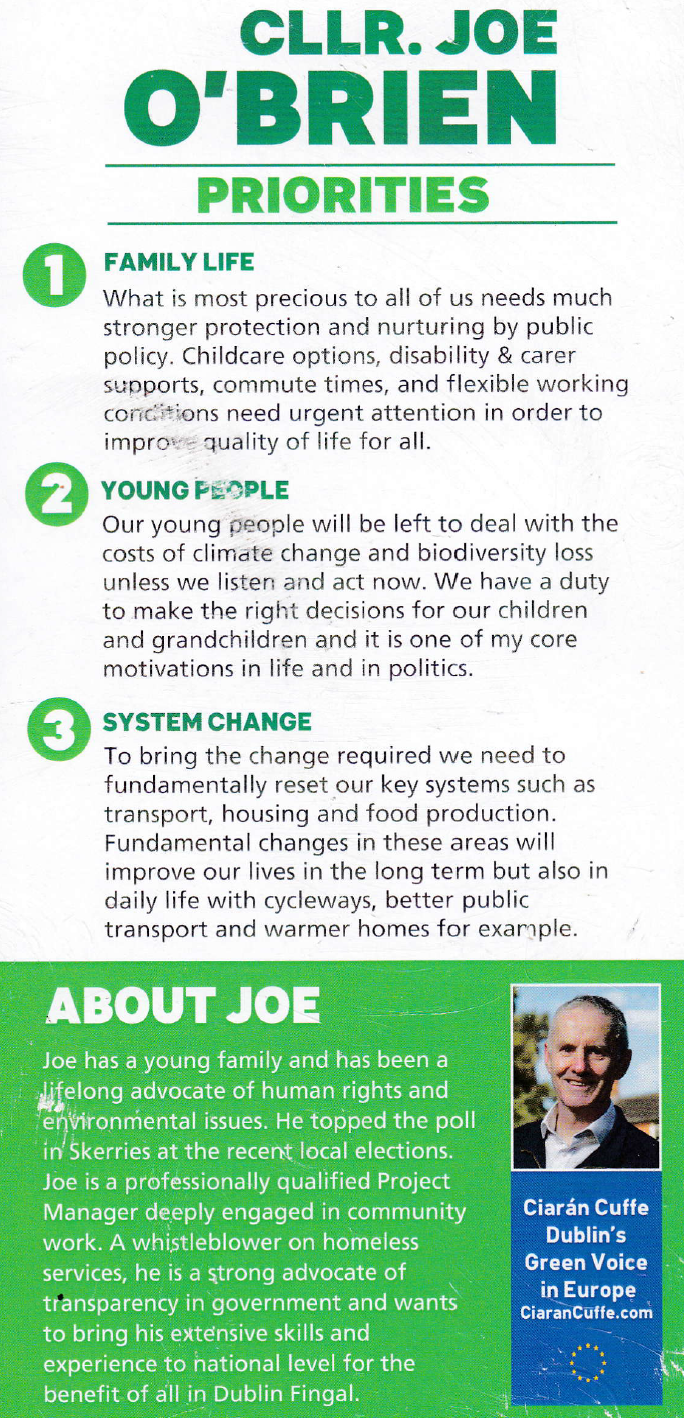 Leaflet from Joe O’Brien – Green Party – 2019 Dublin Fingal By-Election » JoeOBrienBE2