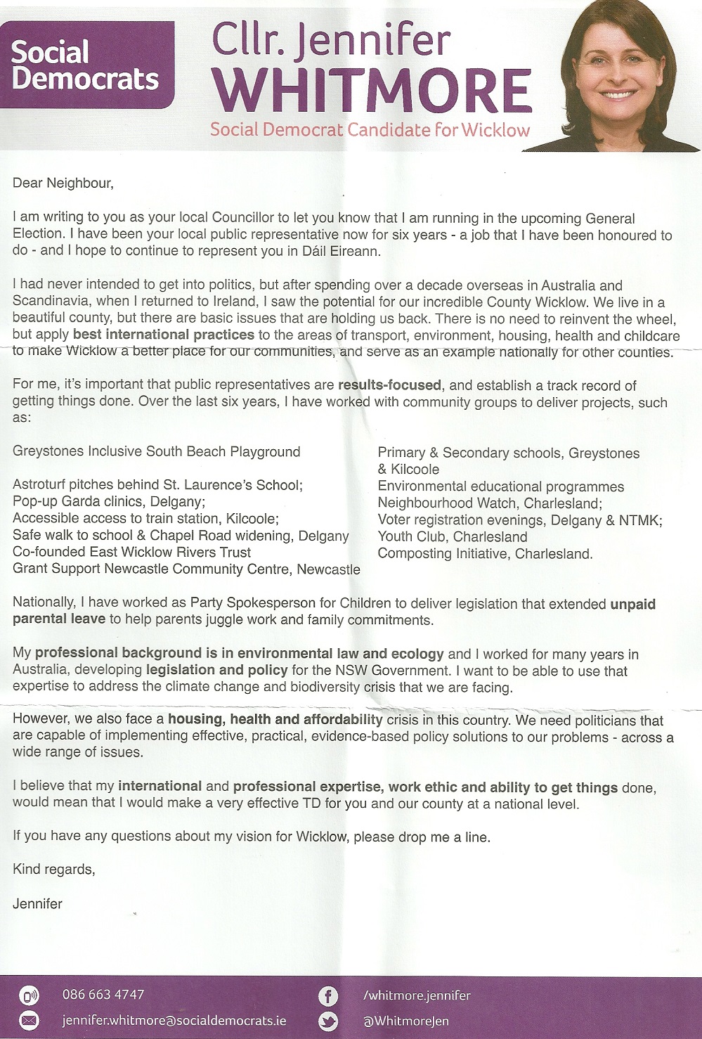 Letter from Jennifer Whitmore -Social Democrats – Wicklow #GE2020 #GE20 » JenniferWhitmoreGE20Letter