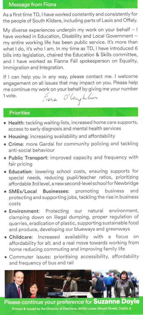 A Leaflet from Fiona O’Loughlin who is running for Fianna Fáil in Kildare South in the 2020 General Election.