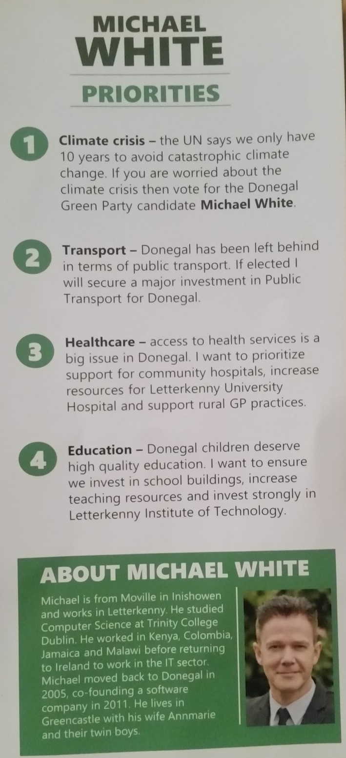 A Leaflet from Michael White who is running for The Green Party in Donegal in the 2020 General Election.