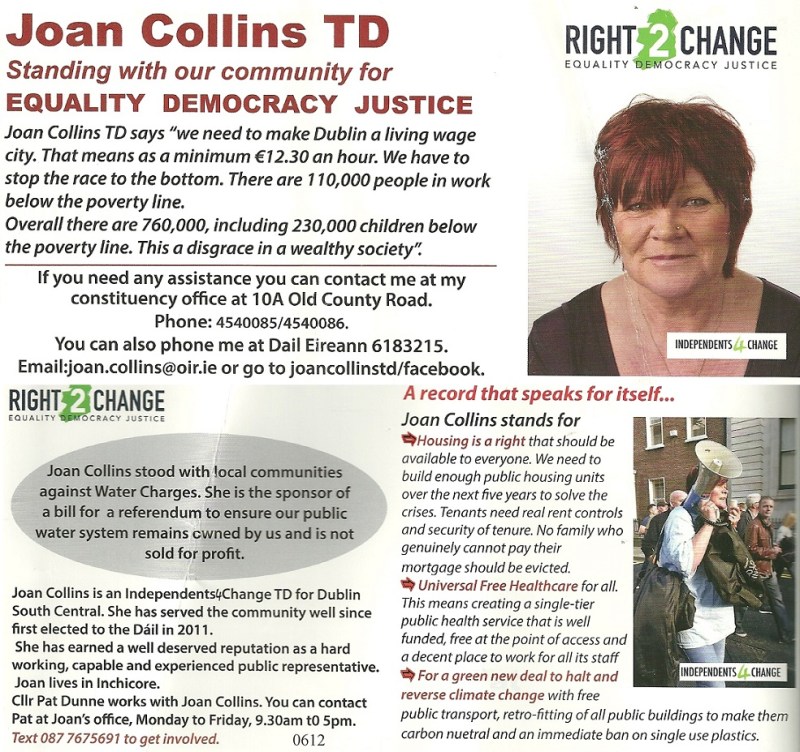 A Leaflet from Joan Collins running as an Independents4Change candidate in Dublin South Central.