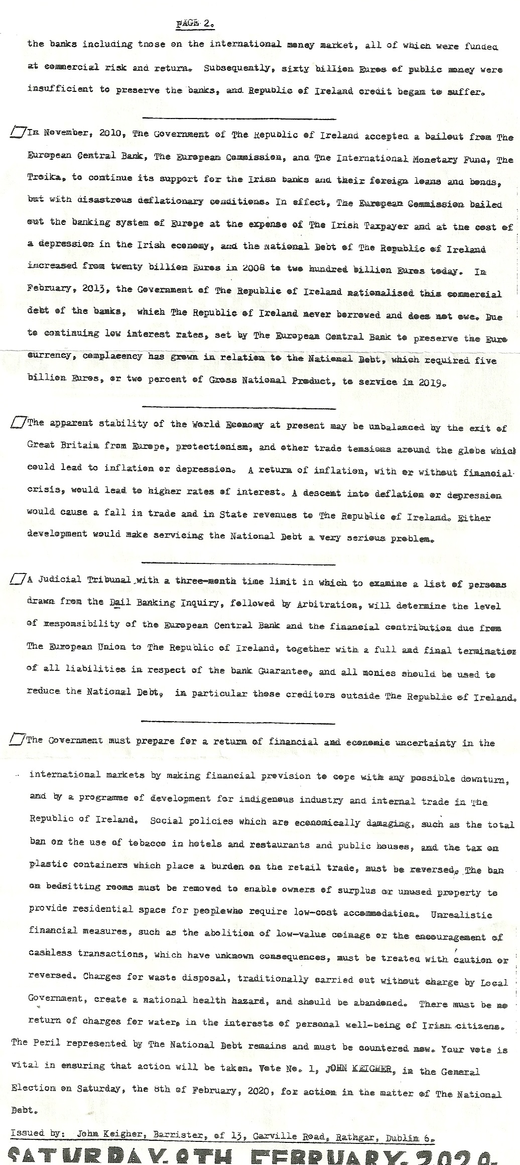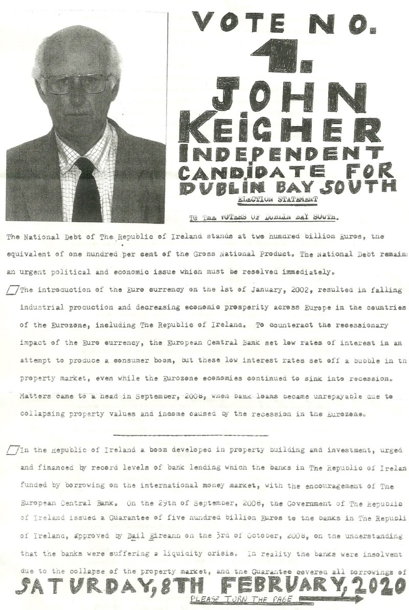 A Leaflet from John Keigher who is running as an Independent in Dublin Bay South in the 2020 General Election.