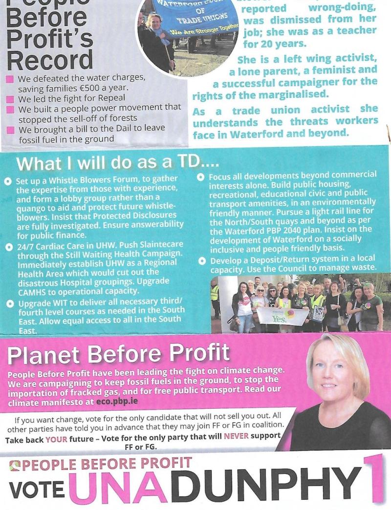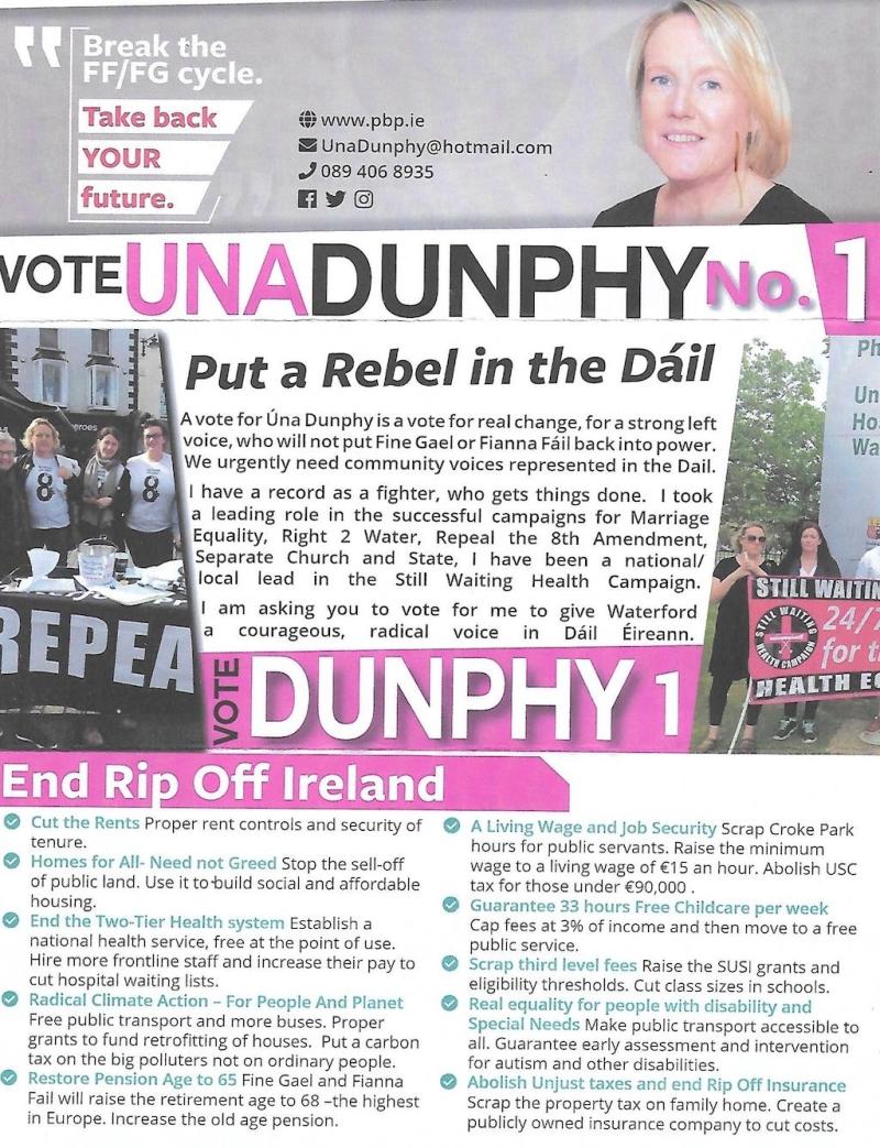 A Leaflet from Úna Dunphy who is running for People Before Profit in Waterford in the 2020 General Election.