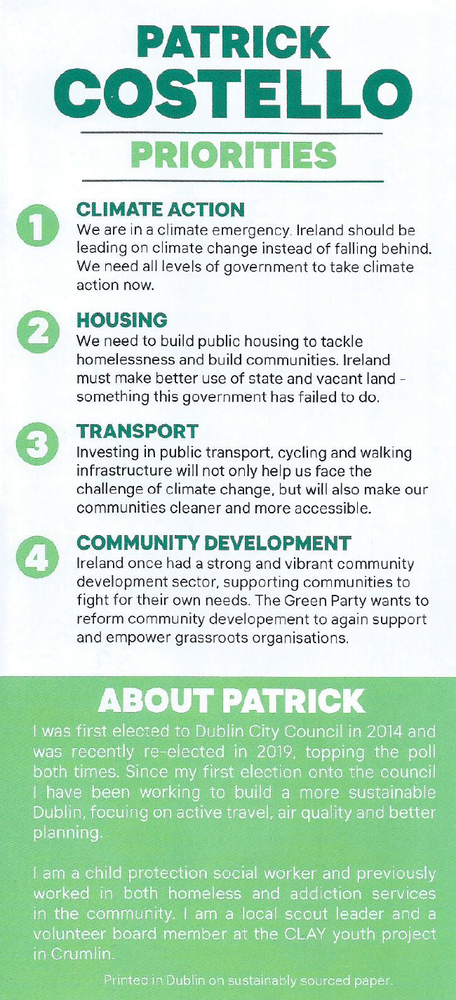 Leaflet from Patrick Costello -Green Party -Dublin South Central #GE2020 » PatrickCostelloDSC2