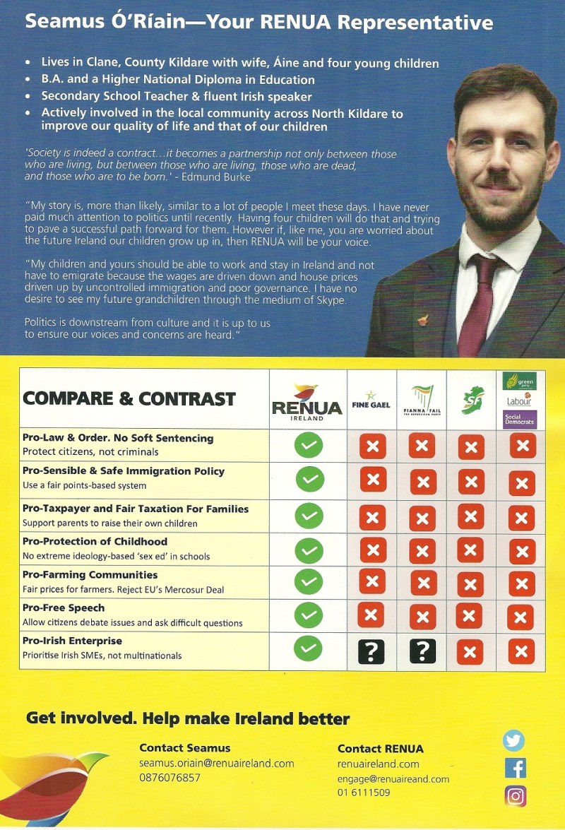 A Leaflet from Séamus Ó Riain running for Renua in Kildare North in the 2020 General Election.
