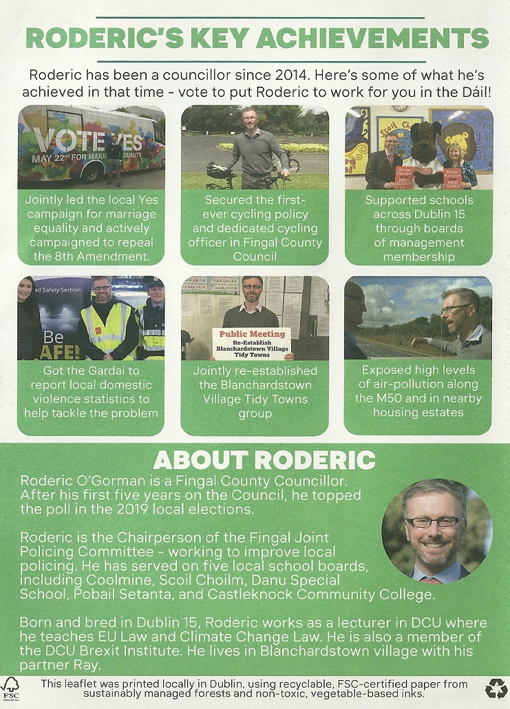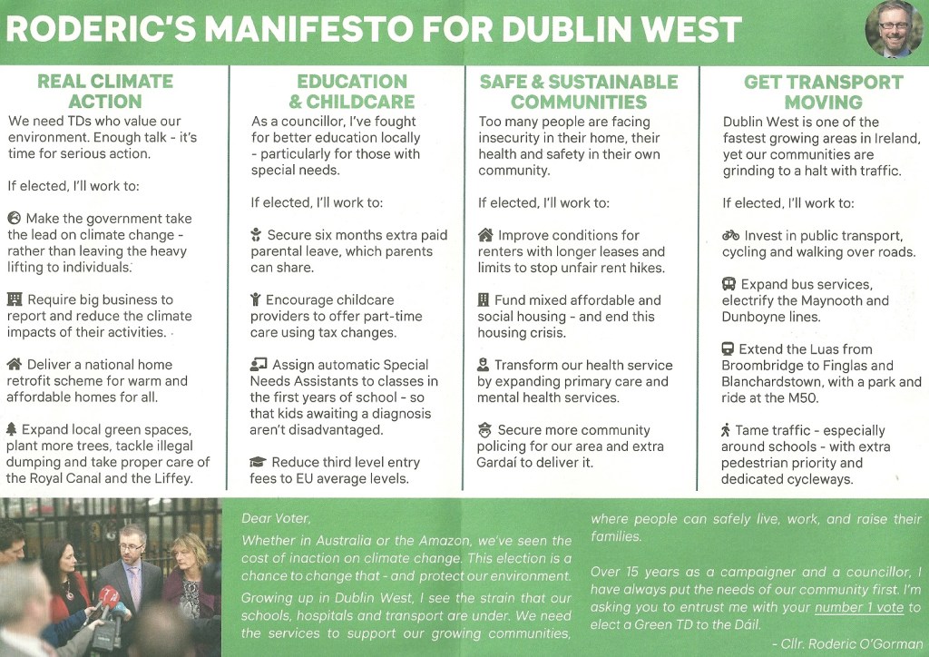 A Leaflet from Roderic O’Gorman of The Green Party who is running in Dublin West in the 2020 General Election