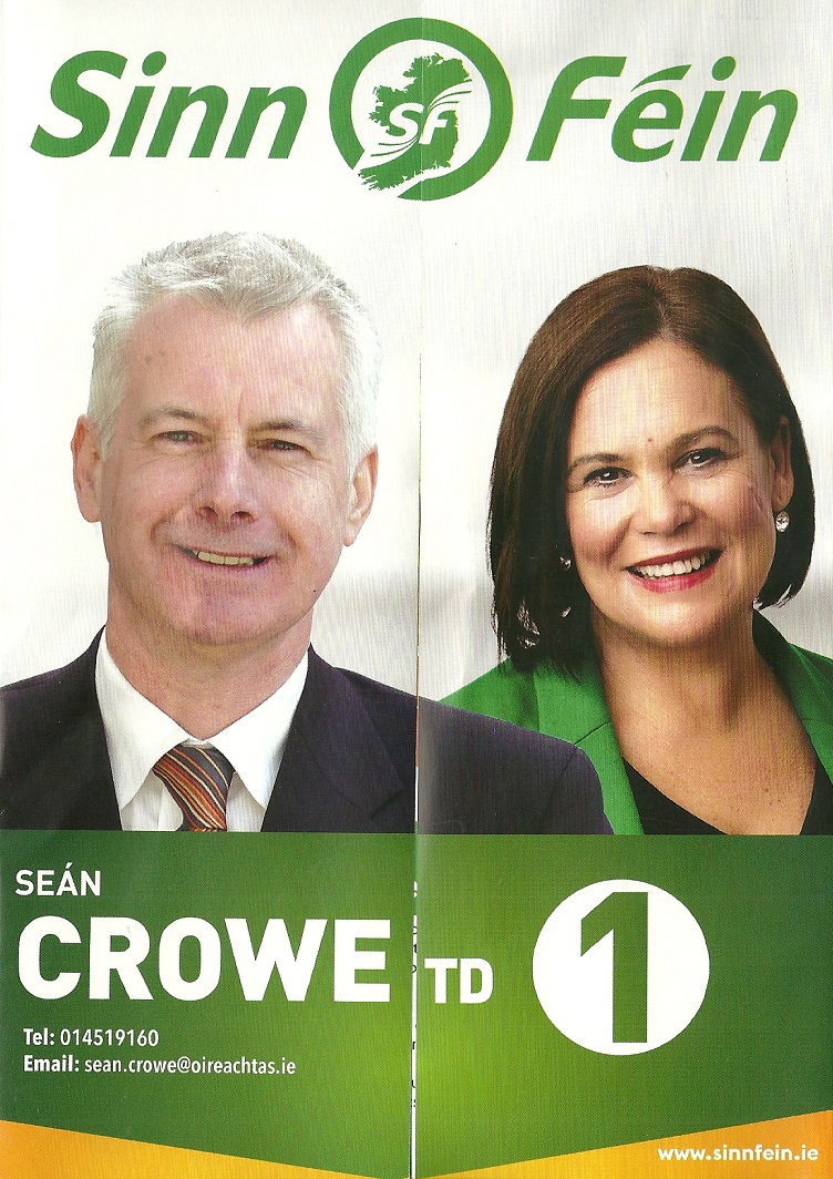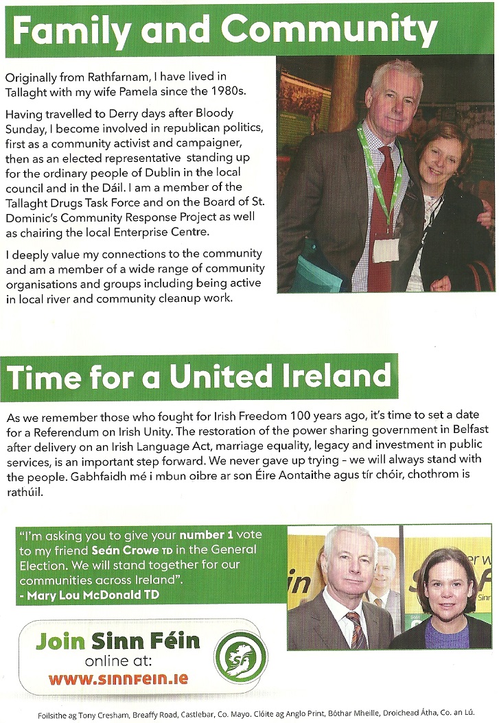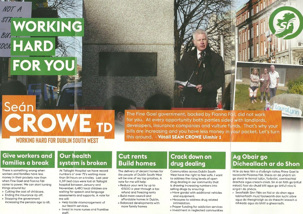 A Leaflet from Sean Crowe who is running for Sinn Féin in Dublin South West.