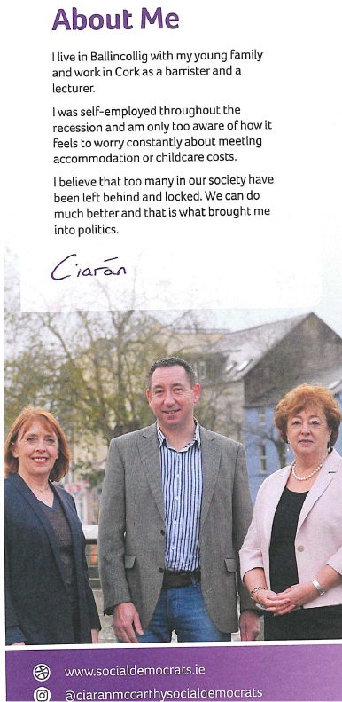 A Leaflet from Ciarán McCarthy who is running for The Social Democrats in Cork North West.