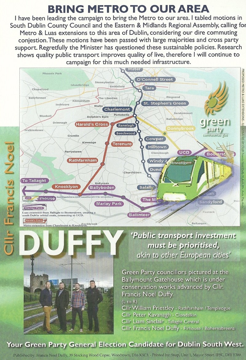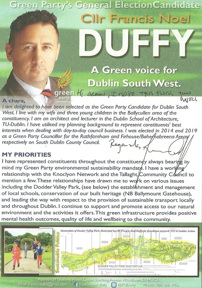 A Leaflet from Francis Noel Duffy running for The Green Party in Dublin South West in the 2020 General Election.