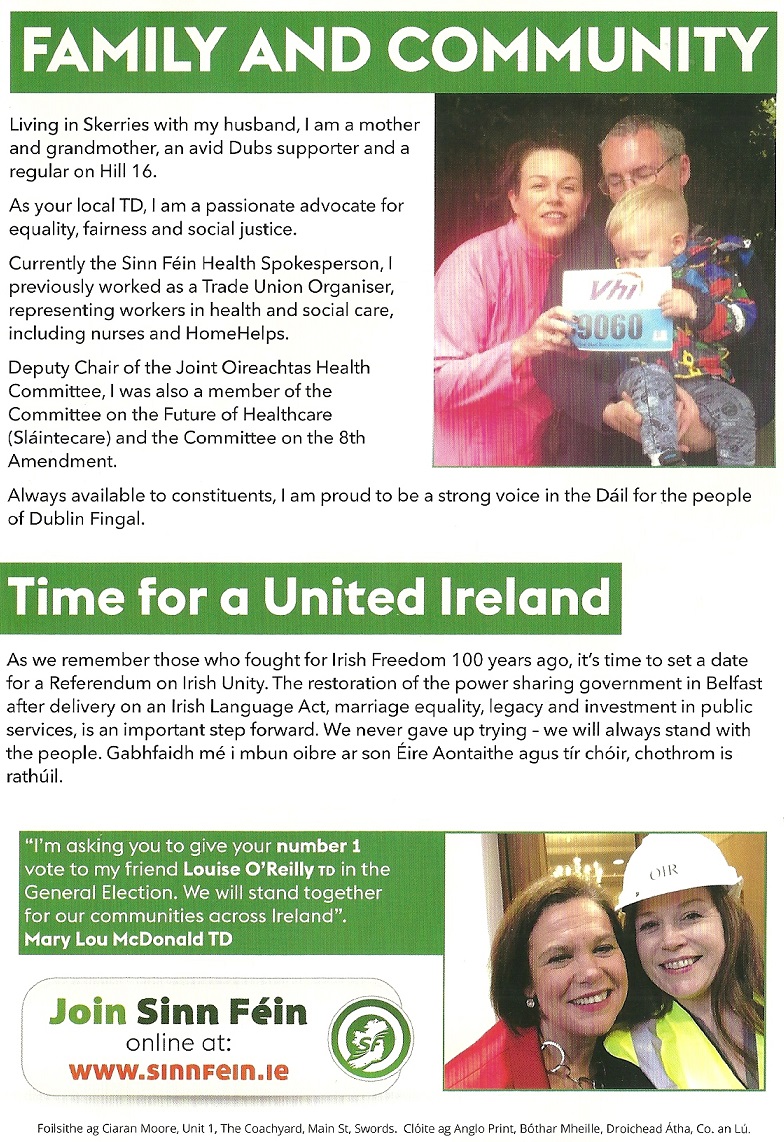 A Leaflet from Louise O’Reilly who is running for Sinn Féin in Dublin Fingal in the 2020 General Election.