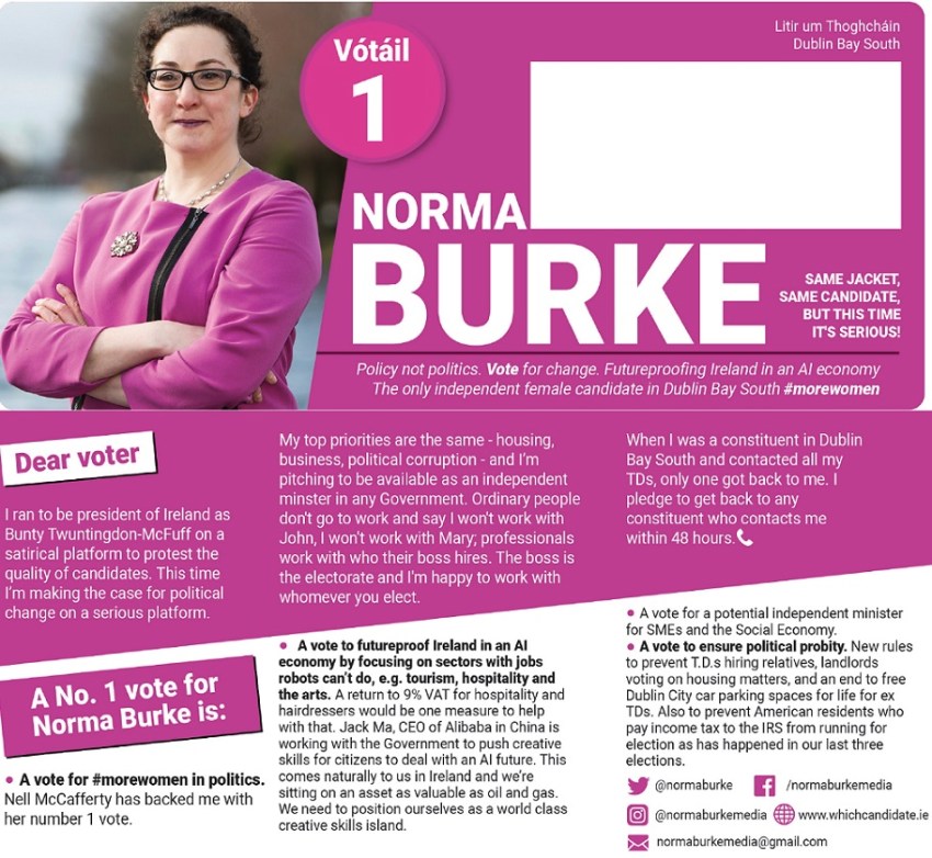 A Leaflet from Norma Burke who is running as an Independent in Dublin Bay South.