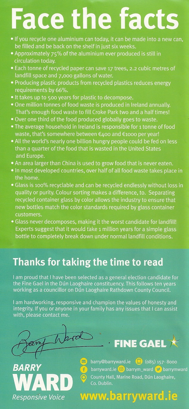 “Easy Everyday Green” a Leaflet from Barry Ward of Fine Gael running in Dun Laoghaire in the 2020 General Election.