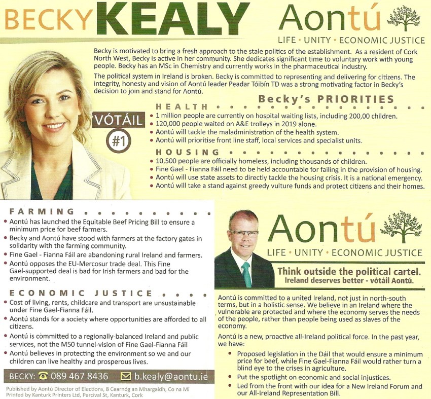A Leaflet from Becky Kealy running for Aontú in Cork North West.