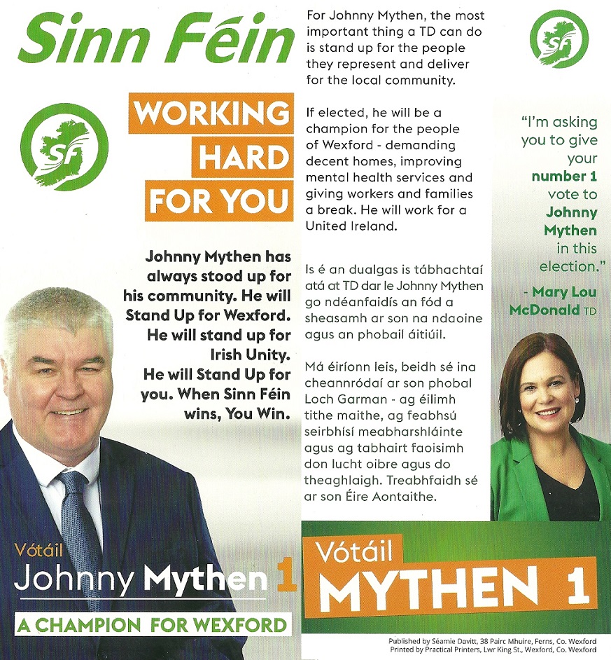 A Leaflet from Johnny Mythen who is running for Sinn Féin in Wexford in the 2020 General Election