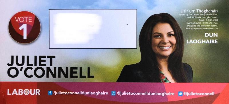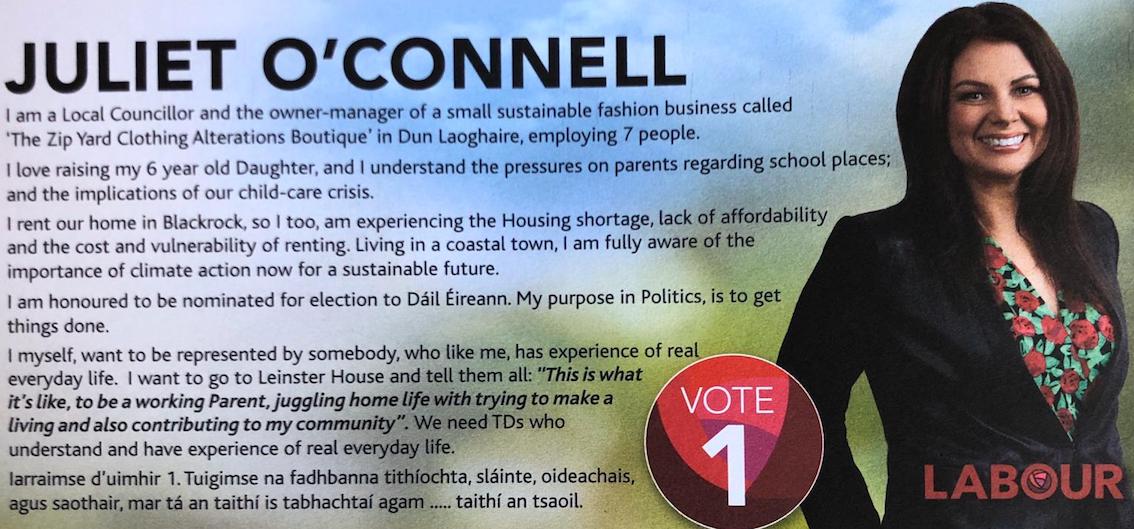 A Leaflet from Juliet O’Connell who is running for Labour in Dún Laoghaire in the 2020 General Election.
