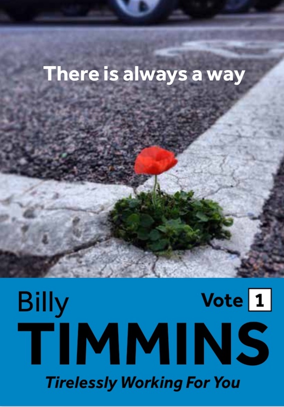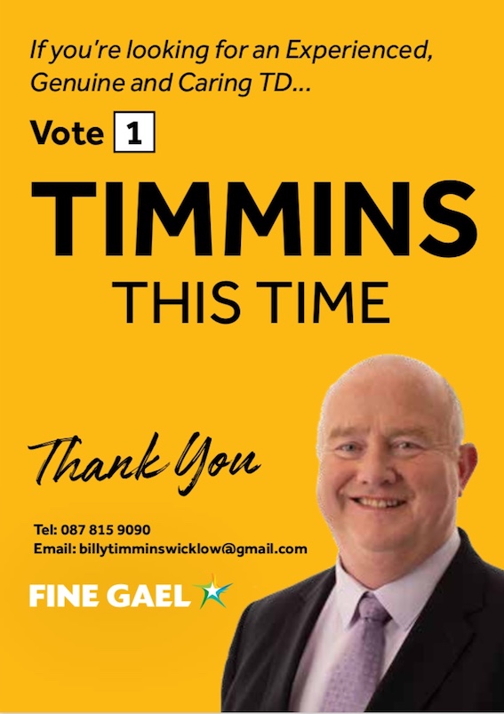 A Flyer from Billy Timmins running for Fine Gael in Wicklow.