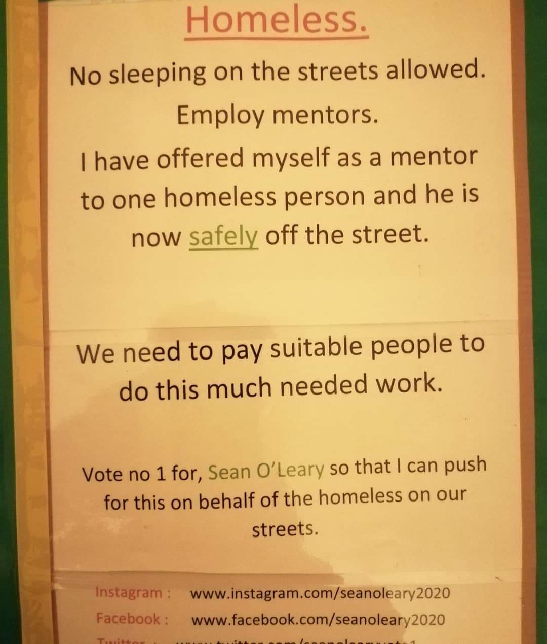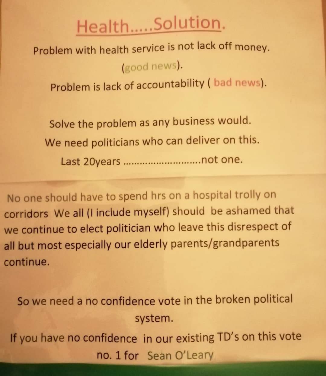 A leaflet from Sean O’Leary who is running as a Independent in Cork East, Dublin West, Dublin South Central, Dublin Bay South, Dublin Bay North, Cork South West, Dublin Central, Cork South central, Cork North Central, Cork North West and Kerry.