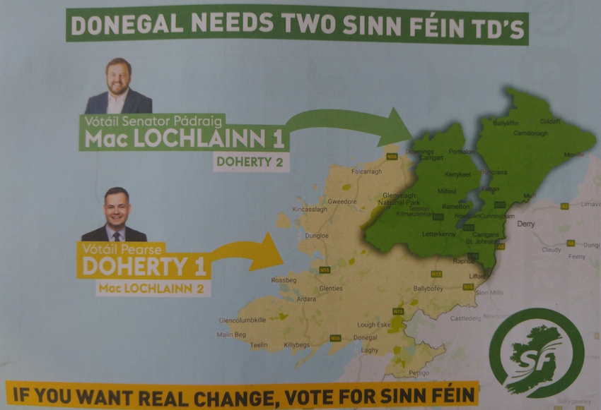 A Sample ballot with map with details of which candidate to vote for in which part of Donegal from Pearse Doherty and Pádraig Mac Lochlainn who are running for Sinn Féin in Donegal.