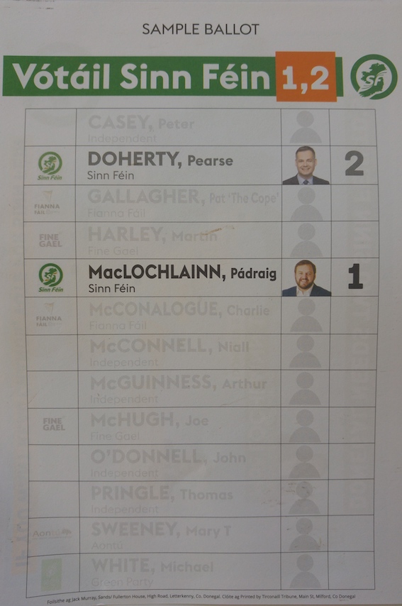 A Sample ballot with map with details of which candidate to vote for in which part of Donegal from Pearse Doherty and Pádraig Mac Lochlainn who are running for Sinn Féin in Donegal.