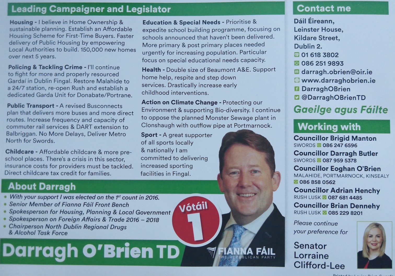 A Leaflet from Darragh O’Brien who is running for Fianna Fáil in Dublin Fingal.