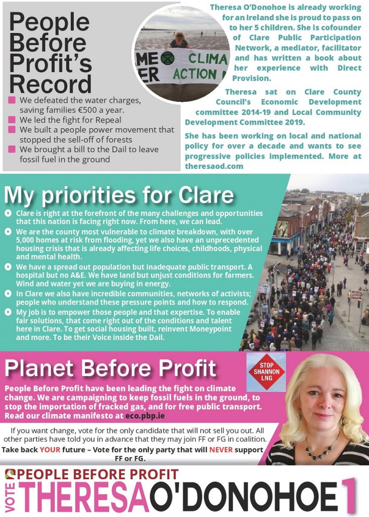 A Leaflet from Theresa O’Donohoe who is running for People Before Profit in Clare.