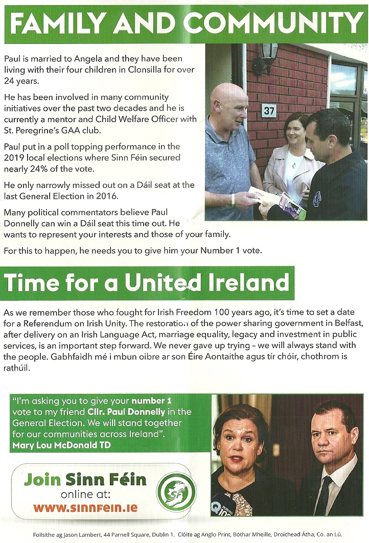 A Leaflet from Paul Donnelly running for Sinn Féin in Dublin West in the 2020 General Election.