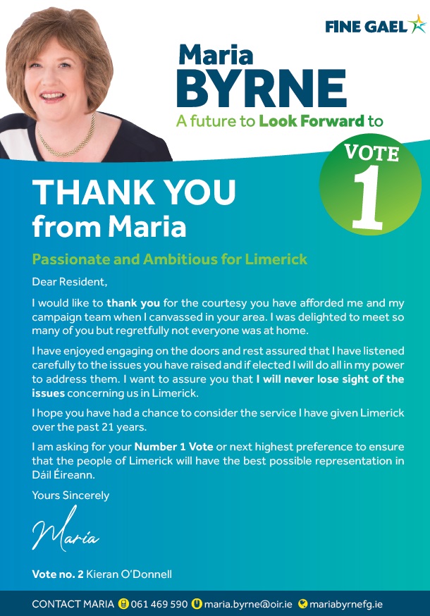 Leaflet with endorsement from Michael Noonan from Maria Byrne -Fine Gael -Limerick City #GE2020 » MariaByrneNoonan!