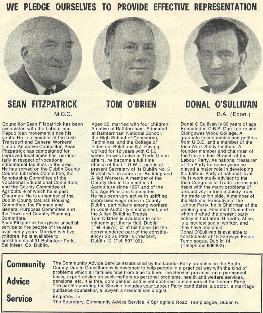 From the 1969 General Election A Leaflet from Sean Fitzpatrick, Tom O’Brien and Donal O’Sullivan who were running for Labour in Dublin County South. None of them were elected (Result here)