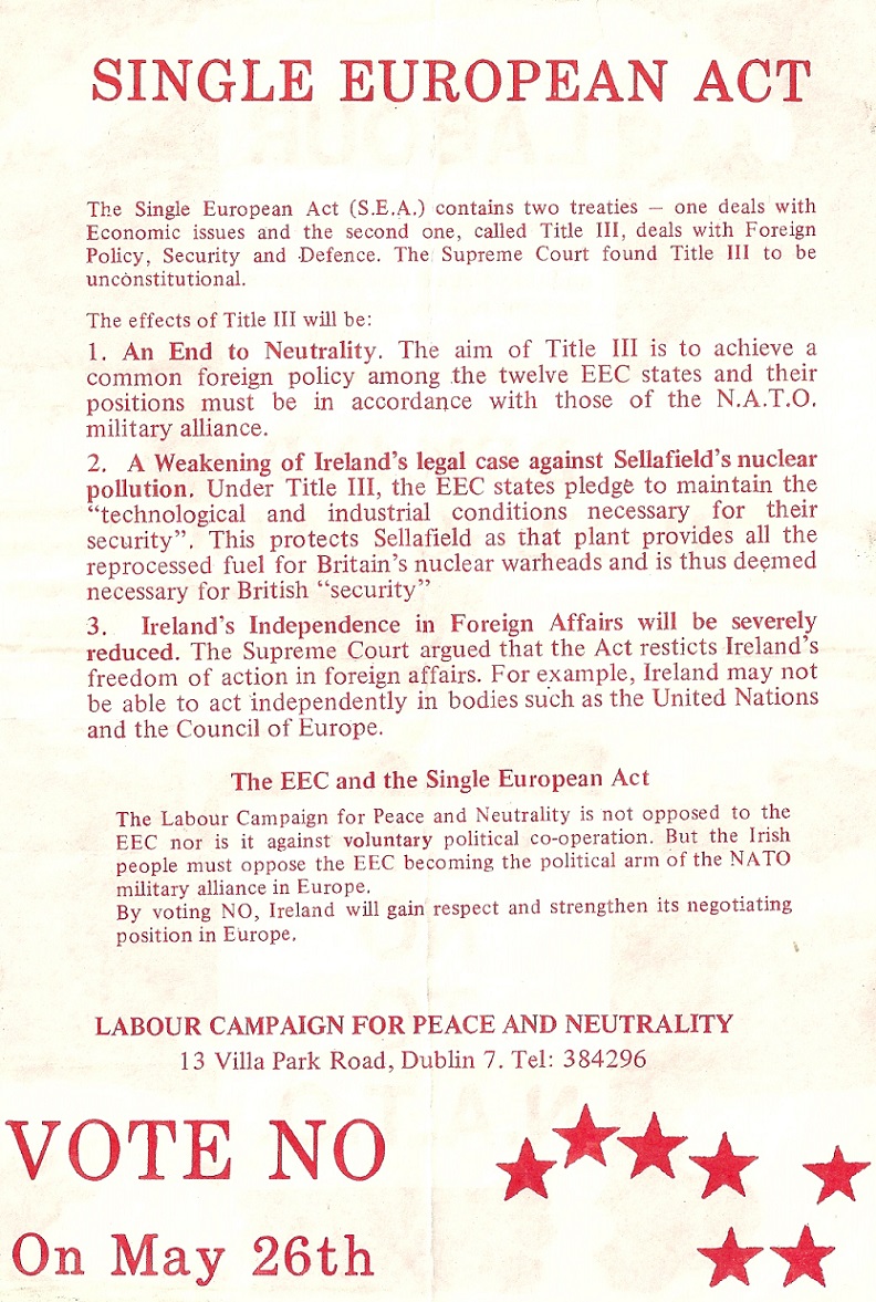 “Vote No To N.A.T.O.” Singe European Act Referendum Leaflet from The Labour Campaign For Peace and Neutrality » SEALabour2
