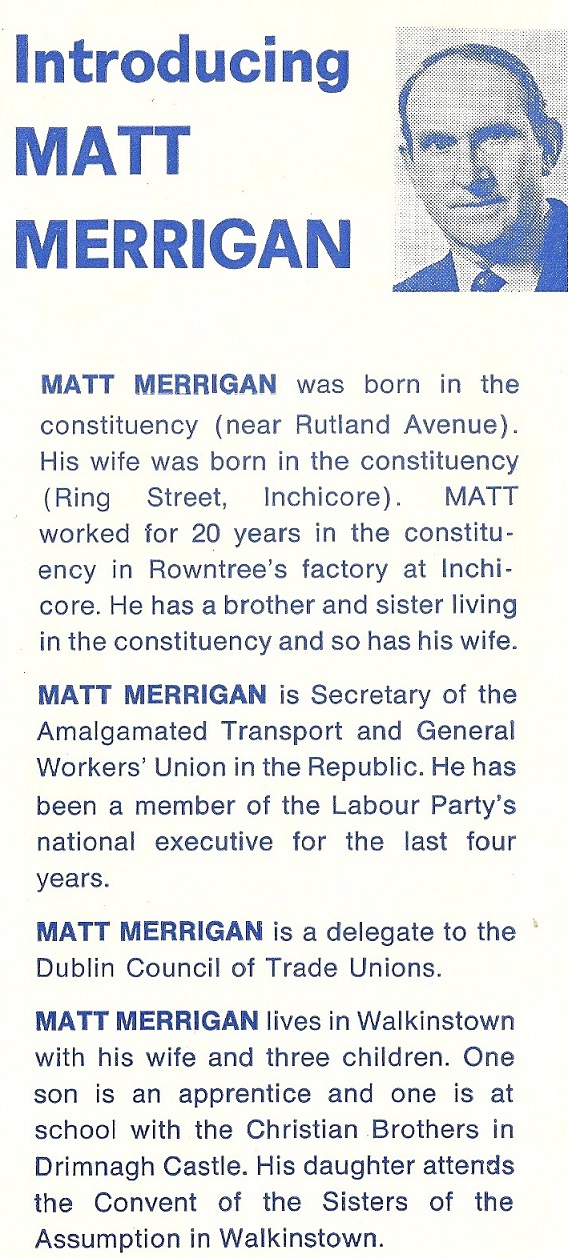 Merrigan polled 5,004 votes losing out narrowly to Seán Sherwin of Fianna Fáil. Sean Dunnes widow Cora Dunne also stood in the by-election and this hampered Merrigans chances. Incidentally Sherwin subsequently joined Aontacht Éireann and of course Merrigan was expelled from The Labour Party in 1977 and subsequently was a founder member of The Socialist Labour Party.